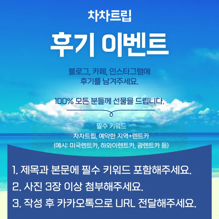 ※ 본 서비스는 차차트립 제휴업체인  Agentcars 와 함께합니다. 본 서비스에서 차차트립은 통신판매중개자로서 통신 판매의 당사자가 아니며 해당 상품의 거래 정보 및 거래 등에 책임을 지지 않습니다.